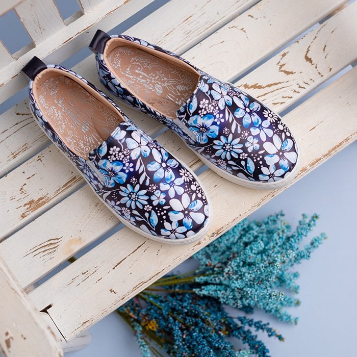 Zarif işlemeli çiçekler; yastıklı ortopedik iç taban, esnek kauçuk dış taban bu ayakkabıyı günlük kullanım için mükemmel kılar.